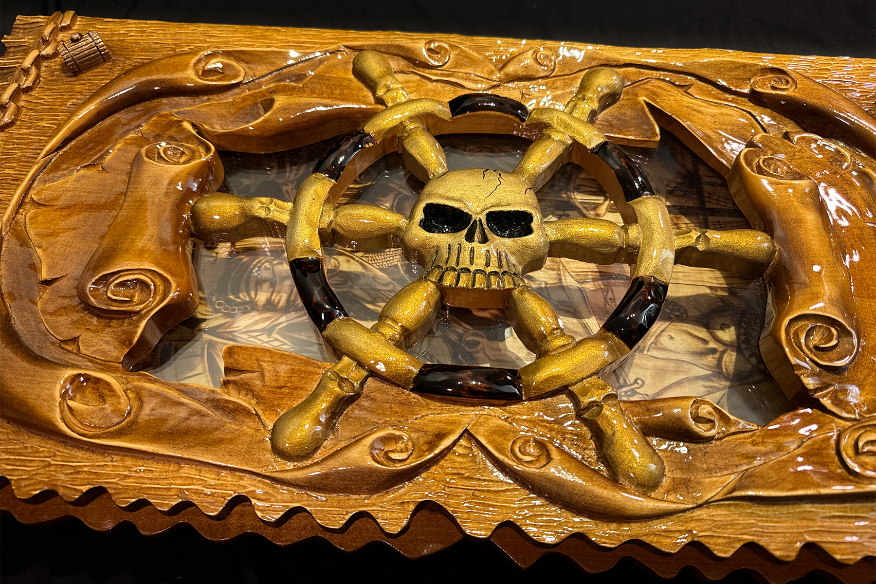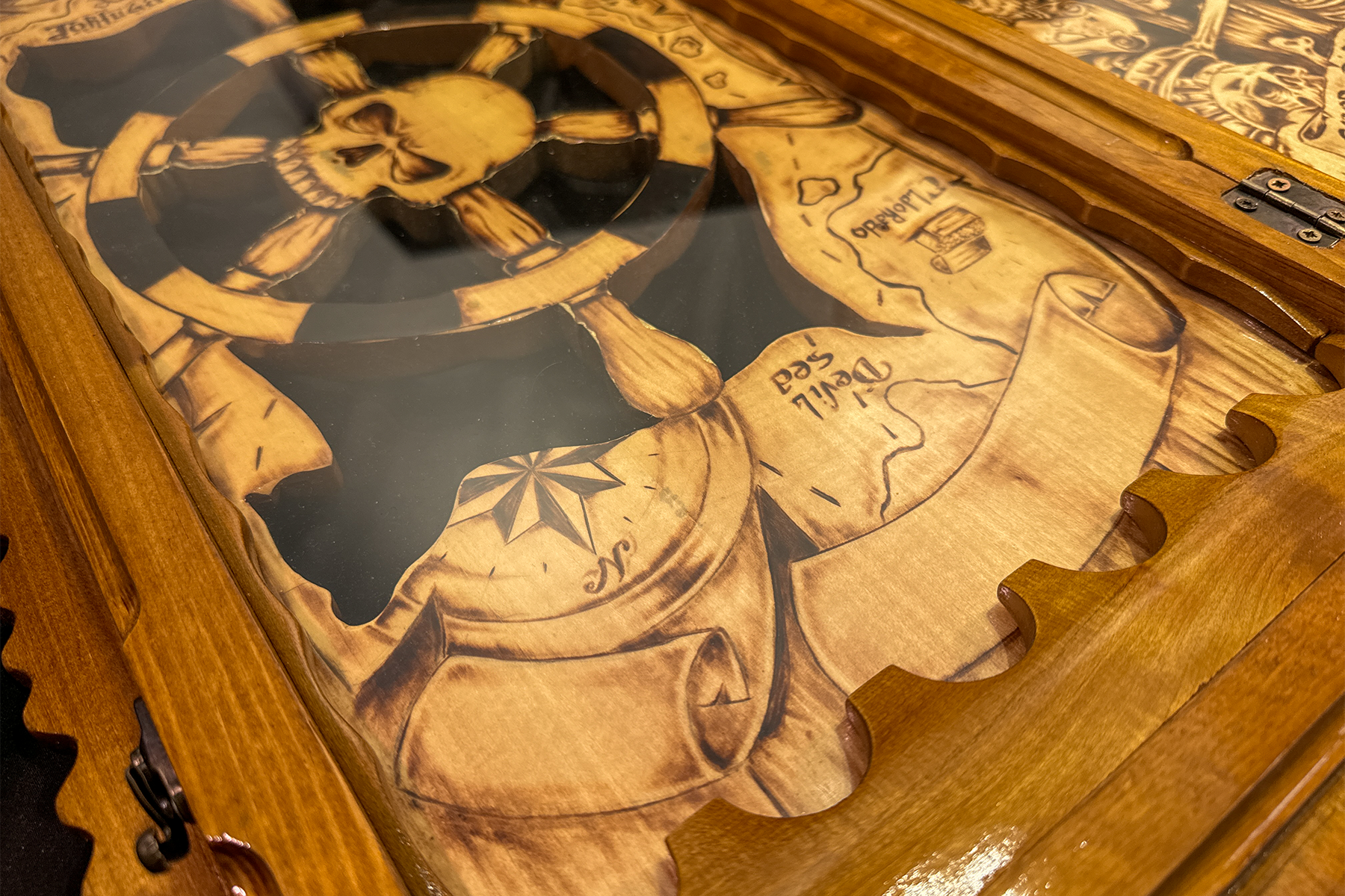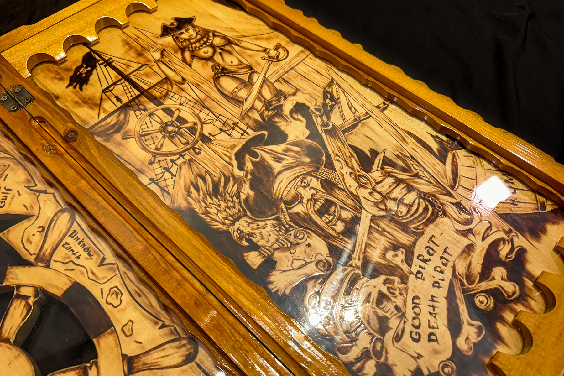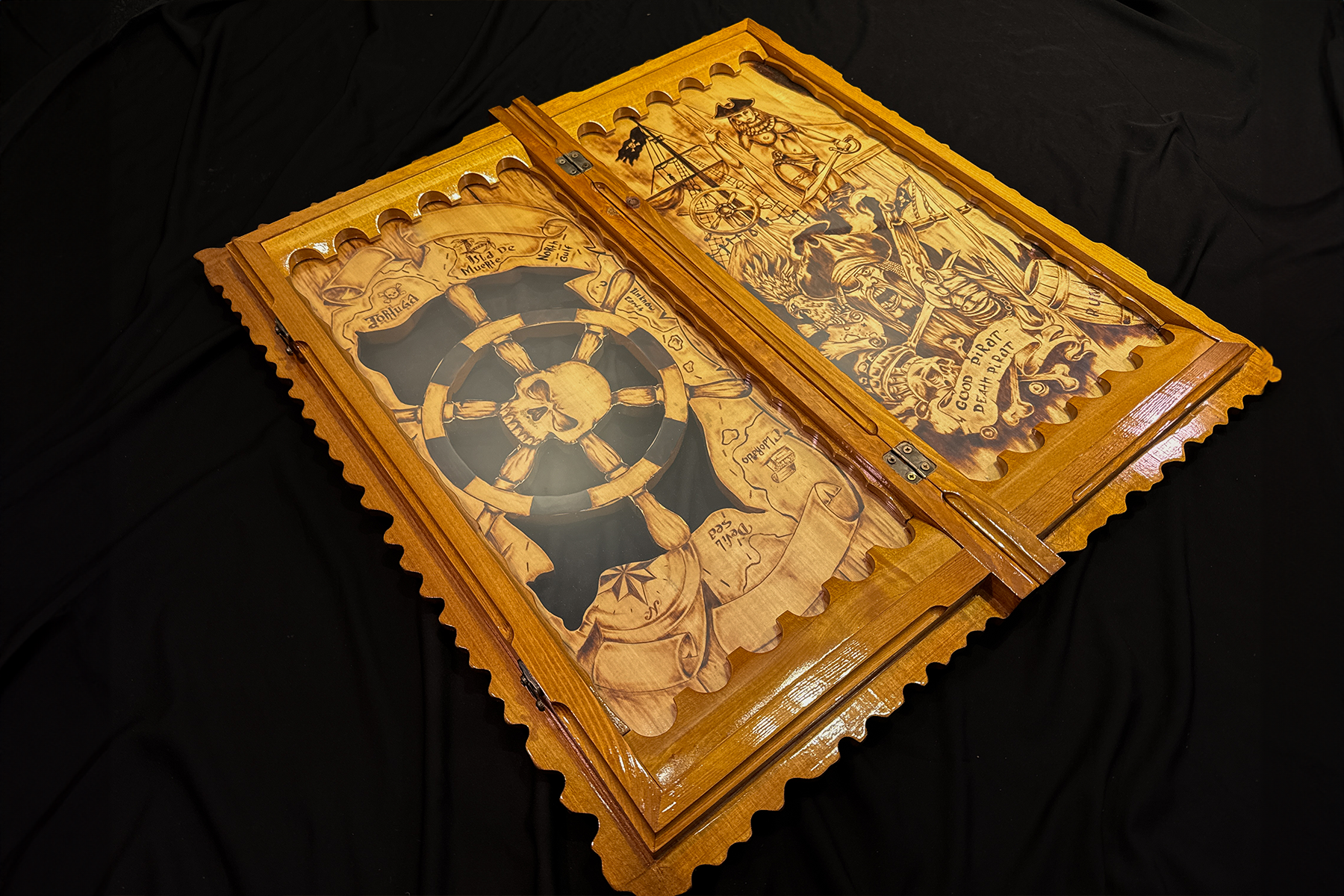 Lucru manual: Table din lemn "Cârmă Aventurilor" cu un design pirateresc unic. Pe o parte a tablei este sculptată cârma unei nave, simbol al călătoriilor și descoperirilor. Pe cealaltă parte este reprezentat simbolul piraților — craniu și oase încrucișate, precum și nave desenate, care adaugă atmosferei de aventuri maritime. În colțurile tablei sunt sculptate butoaie cu rom, subliniind tematica piraterească. Toate elementele sunt atent sculptate și pictate manual, iar tabla este acoperită cu lac pentru protecție și durabilitate. Acest set exclusiv nu este doar un joc captivant, ci și o decorațiune stilată pentru interior sau un cadou valoros pentru iubitorii romantismului marin.