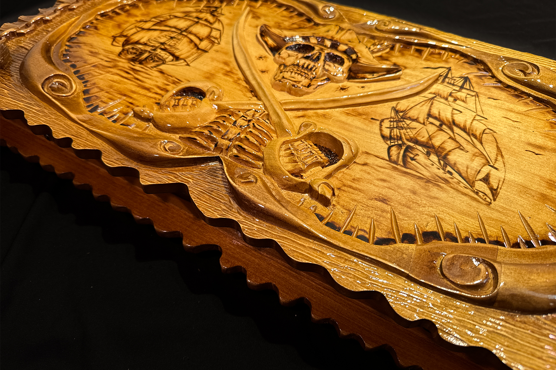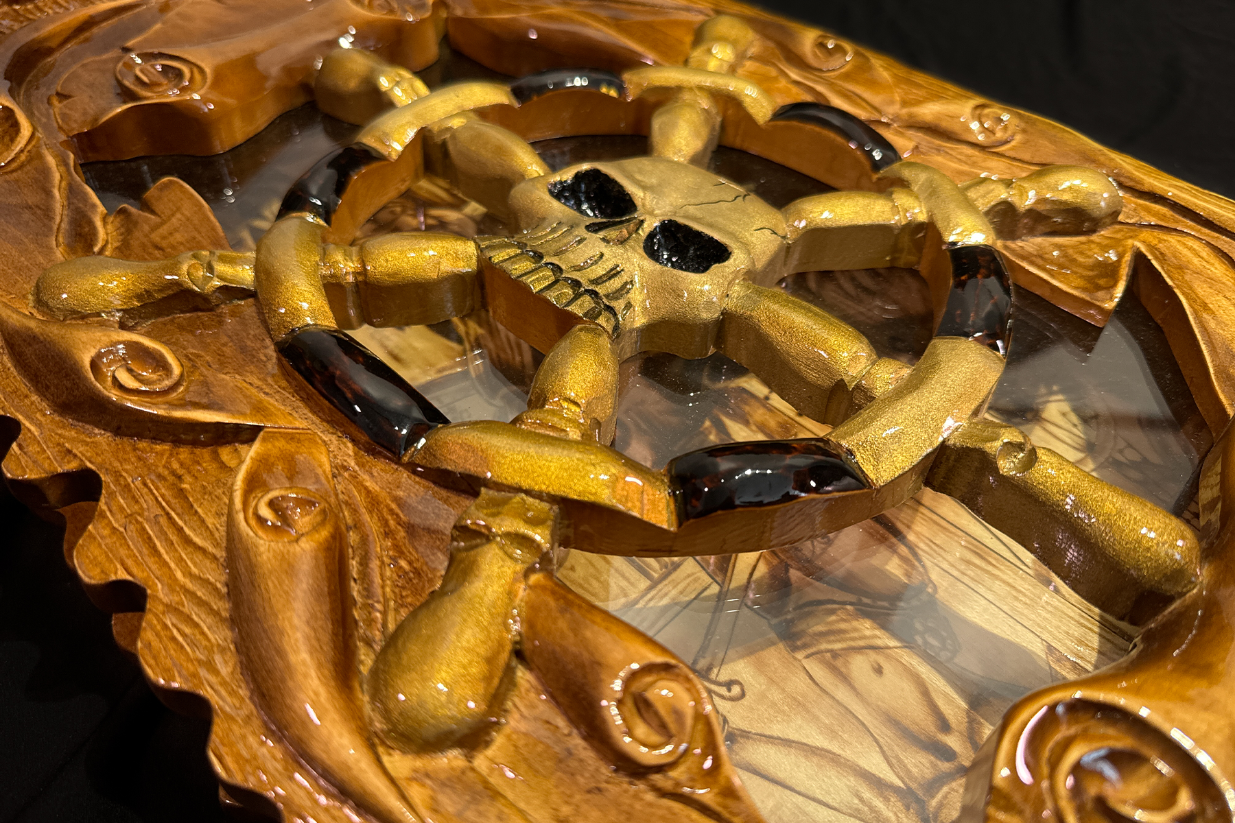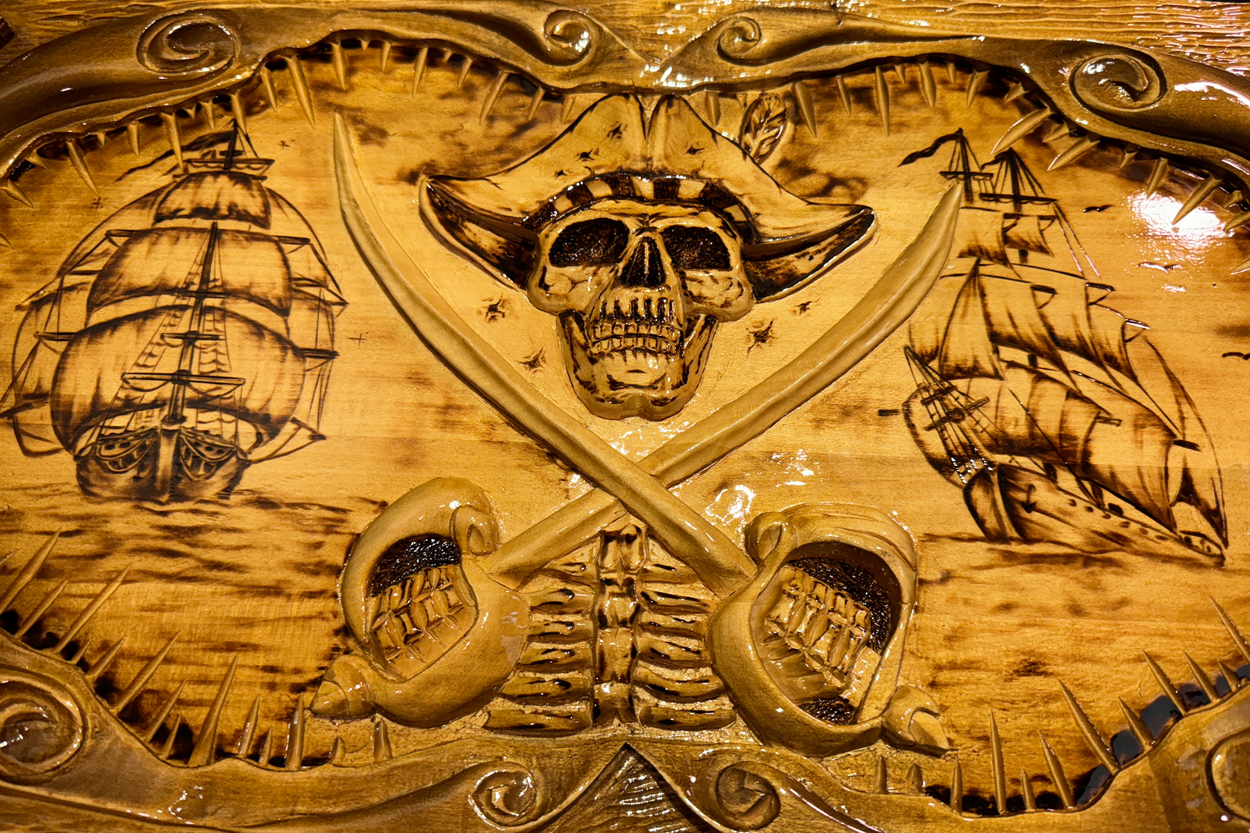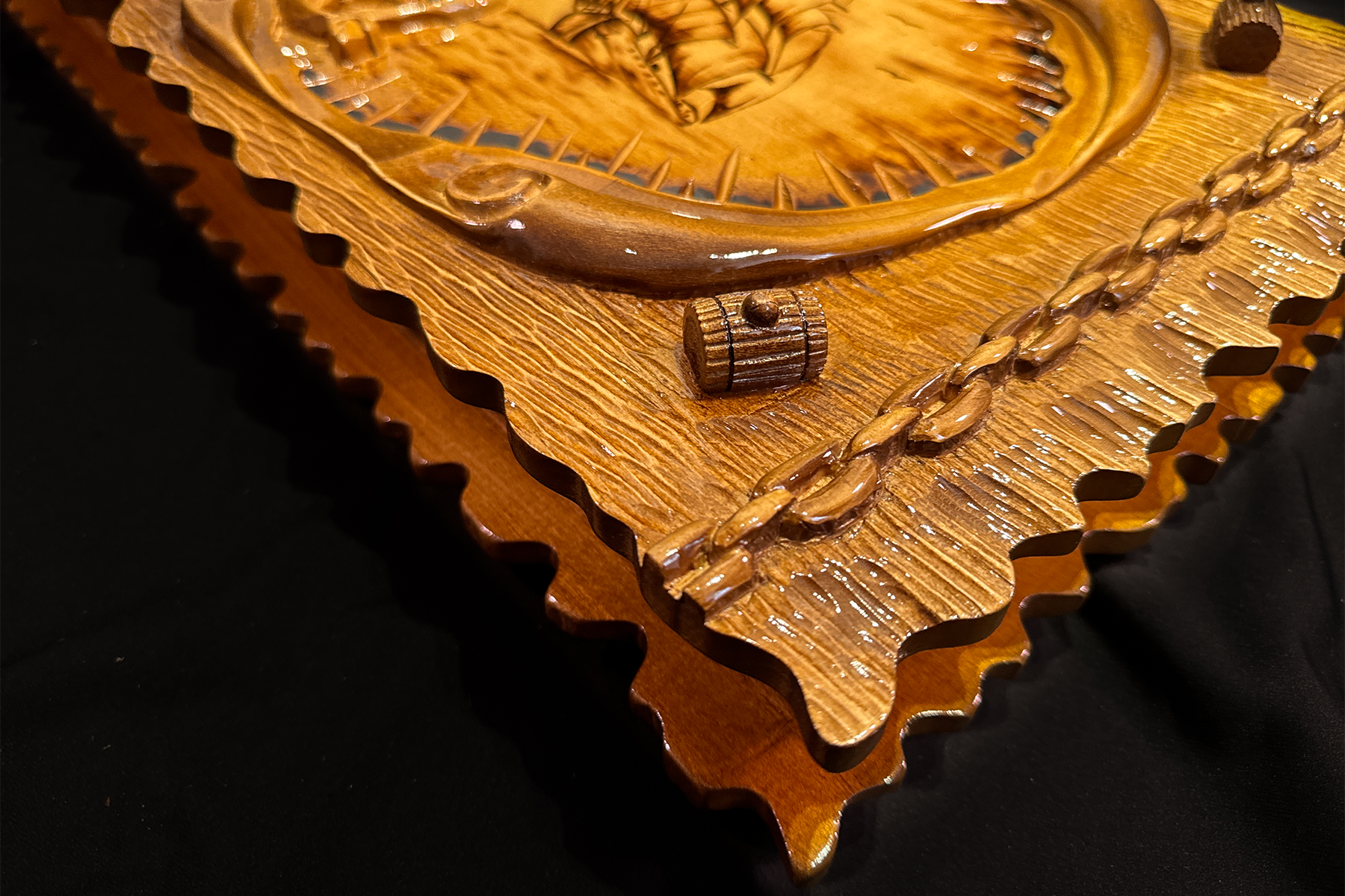 Lucru manual: Table din lemn "Cârmă Aventurilor" cu un design pirateresc unic. Pe o parte a tablei este sculptată cârma unei nave, simbol al călătoriilor și descoperirilor. Pe cealaltă parte este reprezentat simbolul piraților — craniu și oase încrucișate, precum și nave desenate, care adaugă atmosferei de aventuri maritime. În colțurile tablei sunt sculptate butoaie cu rom, subliniind tematica piraterească. Toate elementele sunt atent sculptate și pictate manual, iar tabla este acoperită cu lac pentru protecție și durabilitate. Acest set exclusiv nu este doar un joc captivant, ci și o decorațiune stilată pentru interior sau un cadou valoros pentru iubitorii romantismului marin.