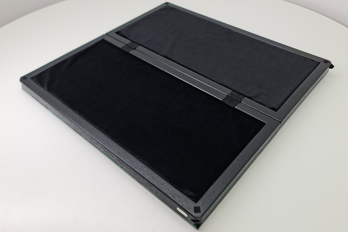 Această ediție specială combină piese acrilice spiralate verde-smarald și transparente, așezate pe o tablă de joc spectaculoasă cu imprimeu UV inspirat de jad și motive decorative clasice. Tabla este din sticlă securizată de 6 mm, iar carcasa este din lemn masiv de frasin, vopsit în negru. Interiorul este căptușit cu fetru moale. Dimensiune deschisă: 50 x 50 cm.